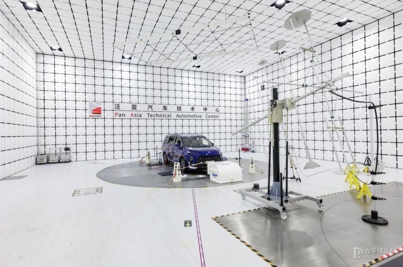 电磁辐射抗扰试验,测试车辆行驶情况下,模拟车上所有用电器在各种工况时通过各种不同的超大型形状各异天线,不同频段不同强度的信号,观测电器工作状态是否被干扰。该测试国标只测一个方向,场强30V/m,别克GL8 PHEV需经历4个方向,场强高达100V/m,确保乘客驾驶的车辆在经过各种电子设备装备的区域都能行车安全。